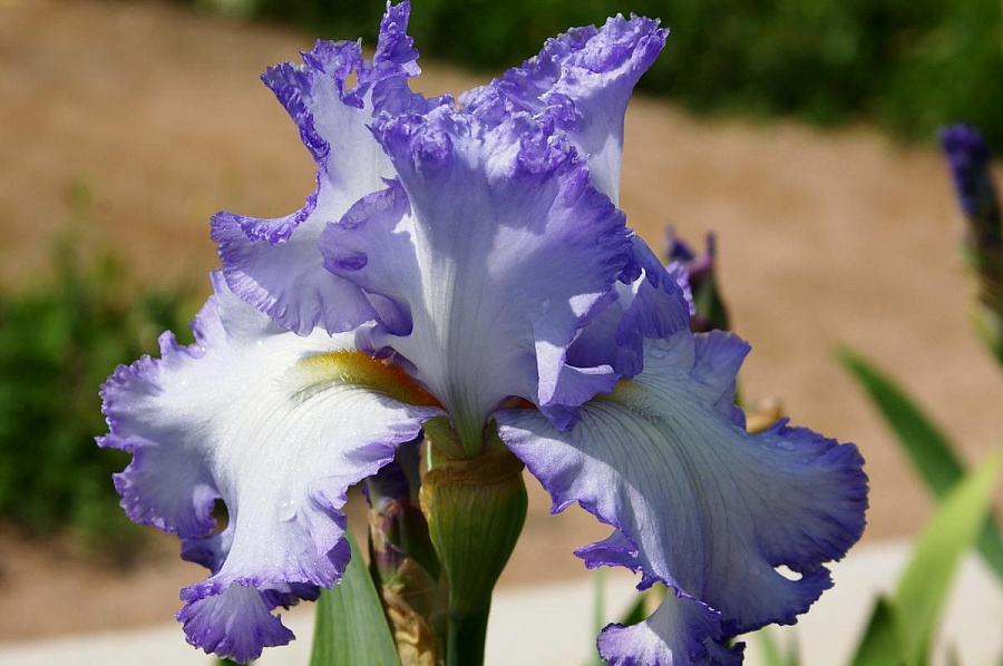 Ирис бородатый "Акрополь" - это великолепное растение, которое поразит вас своей красотой и изысканностью. Его стебель прочный и прямой, достигает впечатляющей высоты, а листья имеют уникальную форму, придающую растению особый шарм. Цветки ириса бородатого "Акрополь" окрашены в нежные голубые оттенки с белым и голубым краем, что создает неповторимый вид.