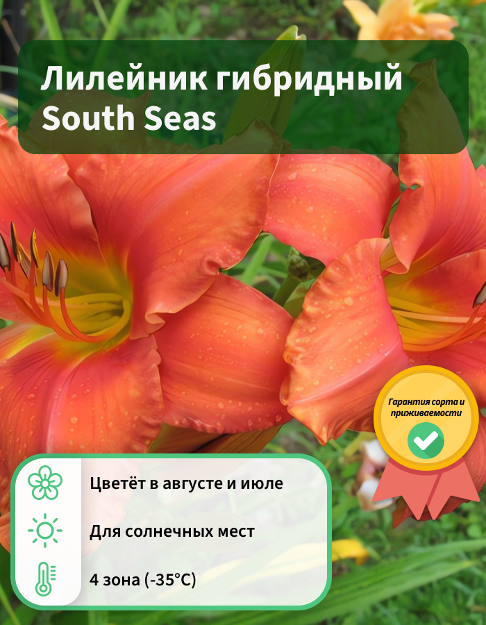 Рассада лилейника "Саус Сиас" (South Seas) предпочитает прохладные и влажные места. При высадке следует избегать кислые почвы и извести. Сорт рассады лилейника "Саус Сиас" устойчив и не требователен. На зиму укрывать не нужно. Цветение обильное и неоднократное. Первые бутоны распускаются в июле. Цветки собраны по 2—10 в раскидистые соцветия. Окрашены в кораллово-оранжевый, почти мандариновый оттенок, без ярко выраженного отдельным цветом горлышка. Диаметр цветочков может достигать до 14 см.