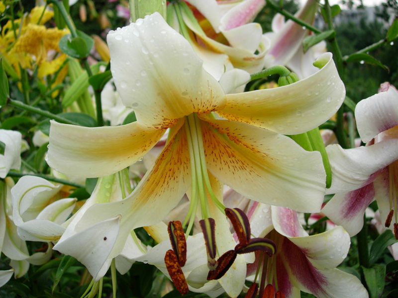 Окраска цветка : белый с желтыми мазками из центра, темно-оранжевыми мелкими штрихами и темными пыльниками